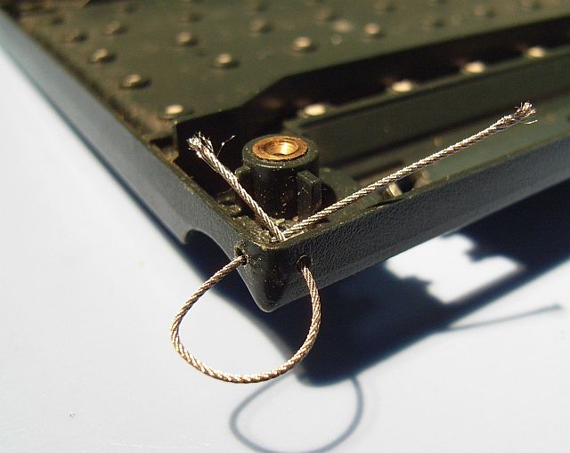 開けた穴に、ステンレスの細ケーブルを通して、ストラップを取り付ける輪を形成します。