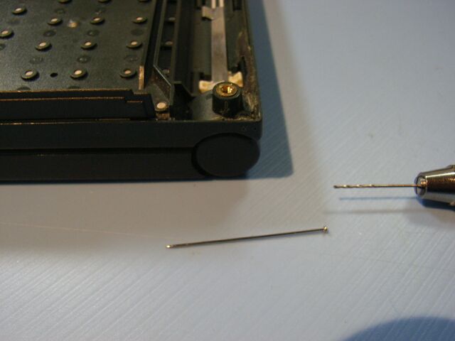 | 虫ピン(ピン針)は、ピアノ線と同様の素材(鋼、はがね)に光沢メッキが施されたものであり、外観が良く、防錆効果も期待できます。 ここでは、0.5mm径のものを使用しました。 取付過程 (1)ドリルで下穴(0.4mm)を開ける。 側面に2カ所 (2)ピンを内側から通す。 (3)折り返し(曲げ)て、別の穴に挿入。 |