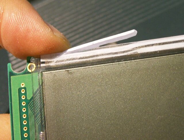 | この修理例は、液晶の縦抜け(白抜け)の原因が、修理不能な電極腐食と同様であるものの、力業(ちからわざ)で無理矢理表示させたものです。 修理に無理があるので、長時間の使用には耐えないかと思います。 |
