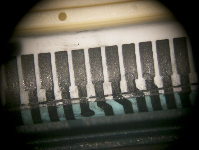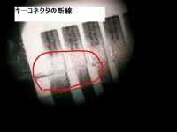 これは別の例ですが、やはり本体を分解する際に傷つけてしまったものです。 この例では断線は無いのですが、左右の接点が電気的に結合してしまっています。