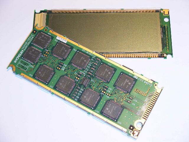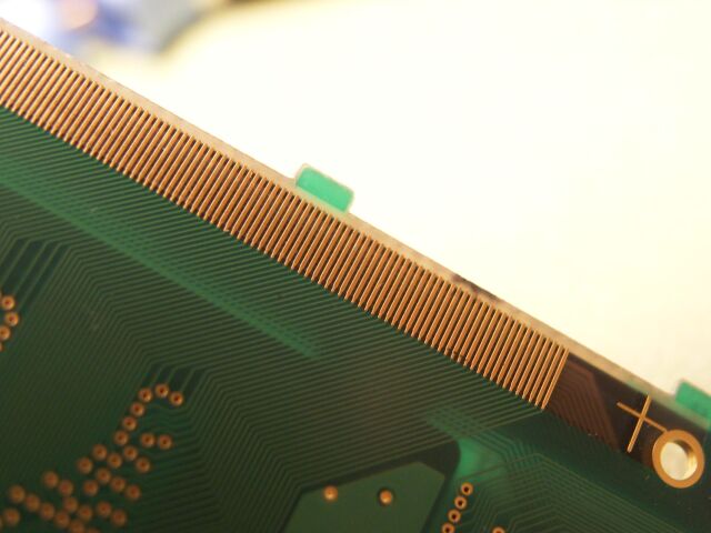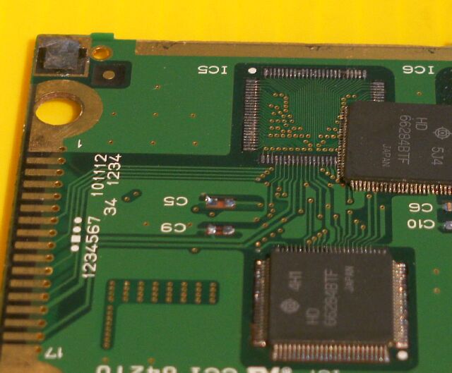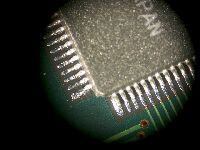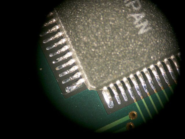 一つのICには足が100本ありますが、この例では4つのICの計400本の足をすべて再半田(一度半田を取り除き、新たに半田付けをやり直す)することで回復しました。 |