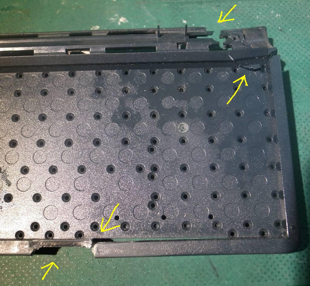 硬いヒンジは、液晶側の筐体だけでなく、それを支えるベースにも致命的(修復困難)な割れを引き起こします。