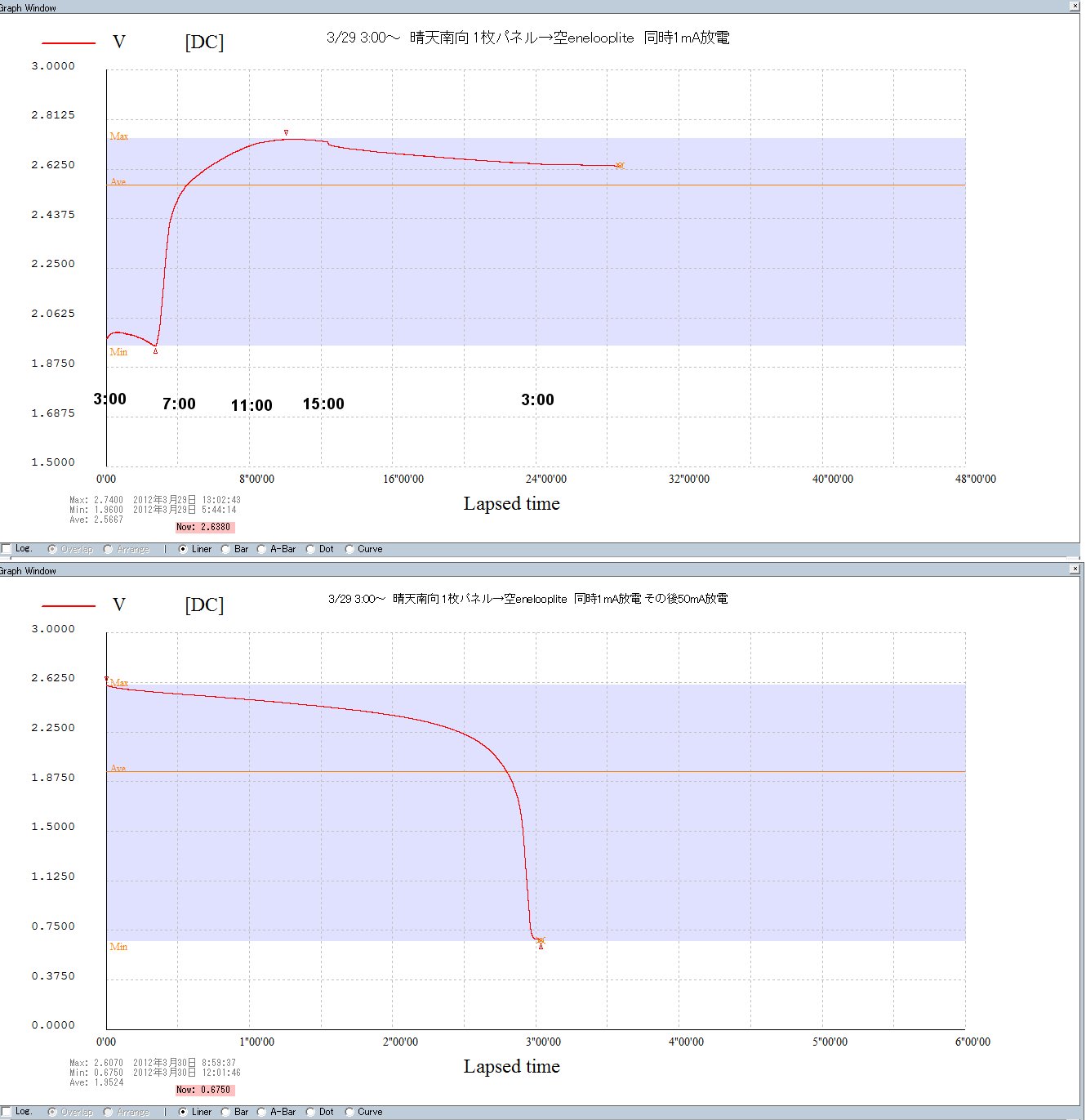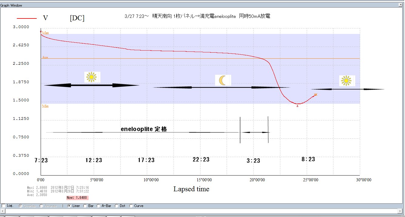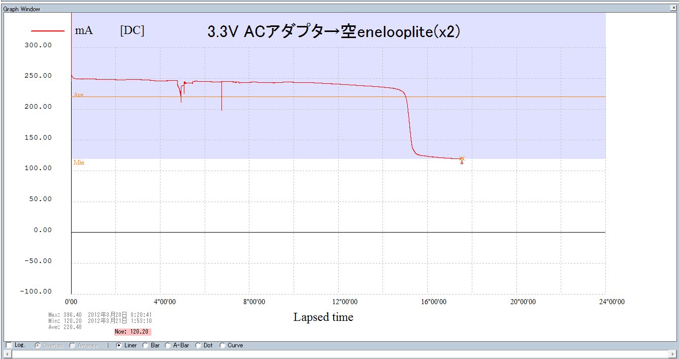 3.3V(ACアダプタ)をeneloopliteにかけたところ、だいたい15時間で急激な電流低下を起こしています。