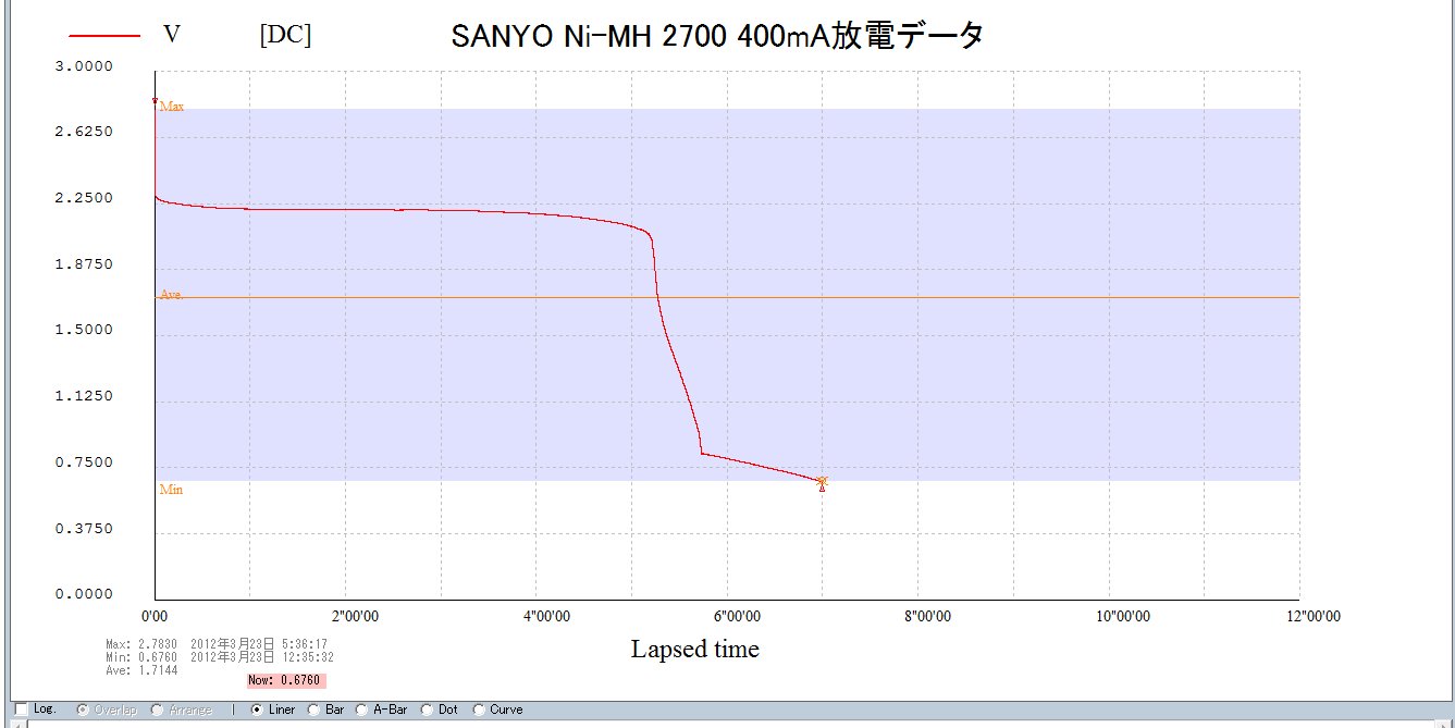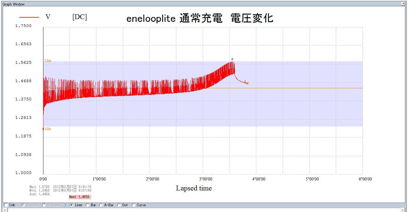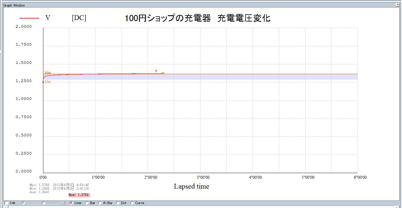 この100円ショップの充電器ですが、2時間ほど電圧変化データを取って、止めました。