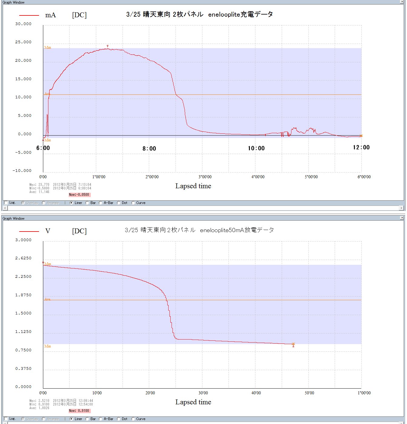 ※晴天、東向き窓へ貼付け、2枚パネル並列、間接光入射で約6時間程度