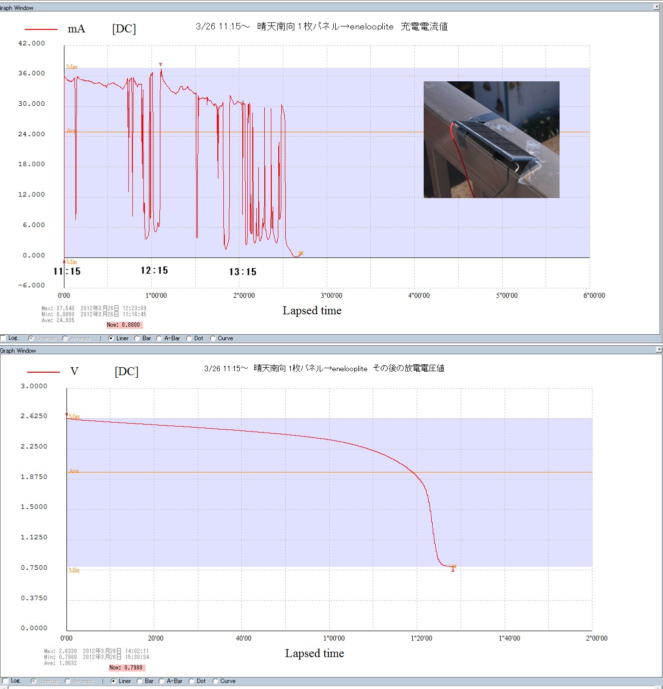 東に向けていますので電流値は僅かしか確保できませんが、夕方頃まで空にしたeleloopliteにつなげて、電圧がどれほど回復するか見てみます。