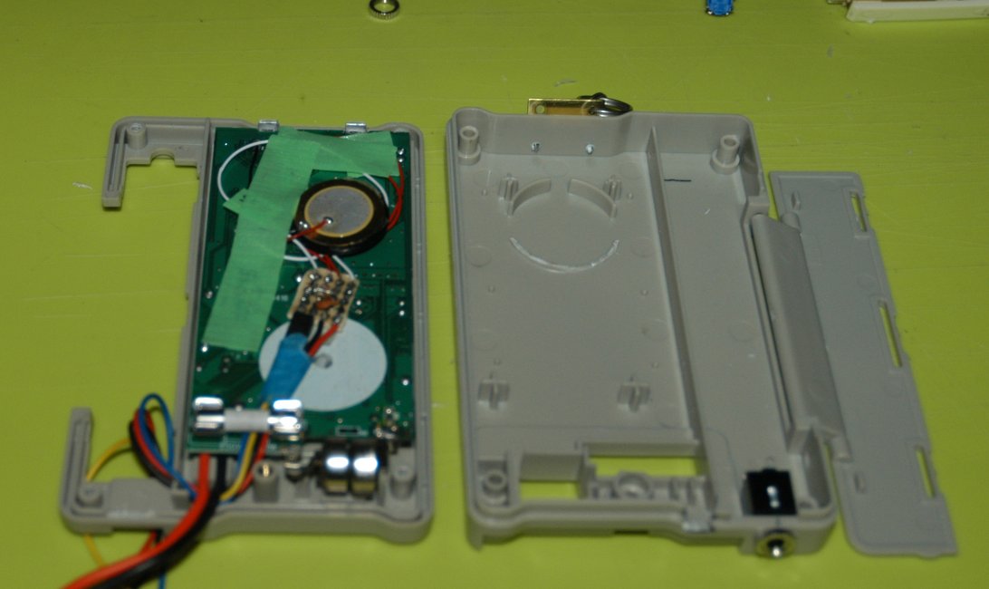 200LXを分解して、DCコンを筒に合せてみました。ちょっときわどいですが、DCコンの基板側の両端を若干(それぞれ0.5mmほど)削ればなんとか入りそうです。両端部分はピン足のパターンしかありませんから、大丈夫でしょう。どのみちこのDIPピンは取り外しますし。