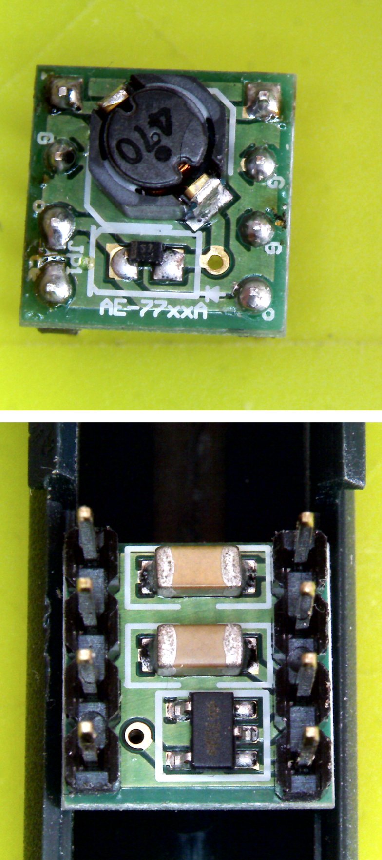 DCコンはできれば基板のまま使いたいところですが、このDCコンで使われている部品自体は、インダクタ、ショットキバリアDi、超小型のコンバータチップ(HT7733AのSOT23)だけですので、いざとなれば基板を使わず分解そのまま配線、樹脂密封もあり。豆粒ほどに小さくなりますよ。