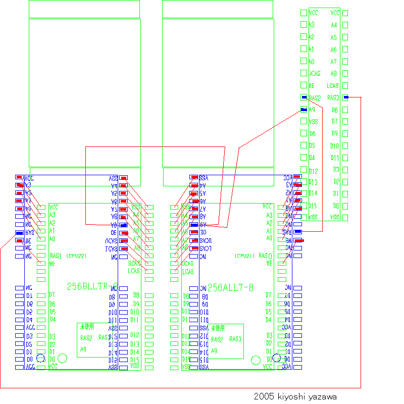 上の配線図とほぼ同じ配置での写真を示します。 上がRAM、下が重ねたメモリ、右がソケットの空きランドになります。 引き出し線は、左右の2本がRAS、中央の赤色電線がA9になります。 |