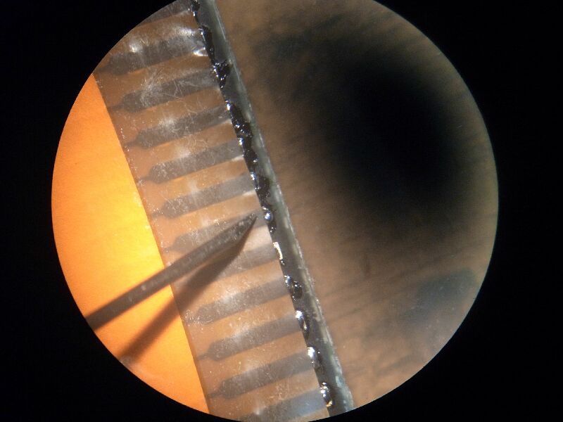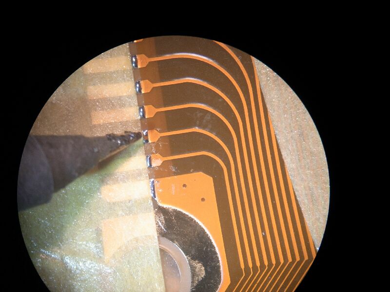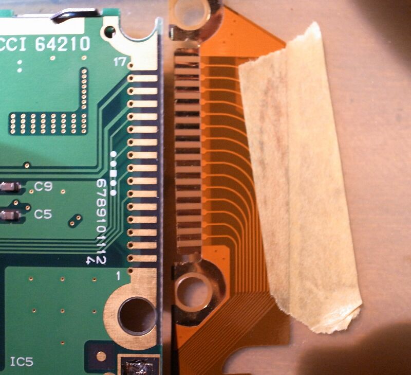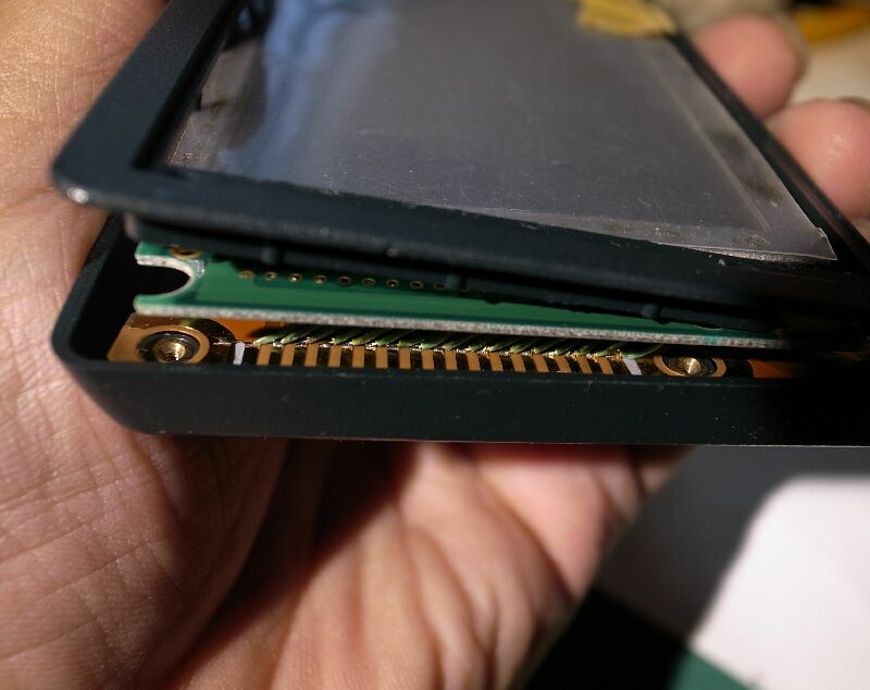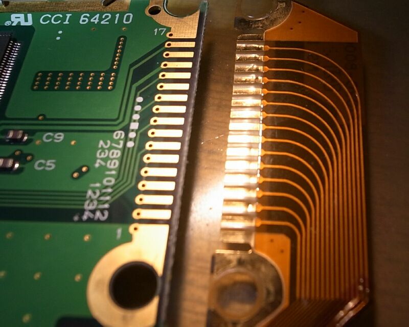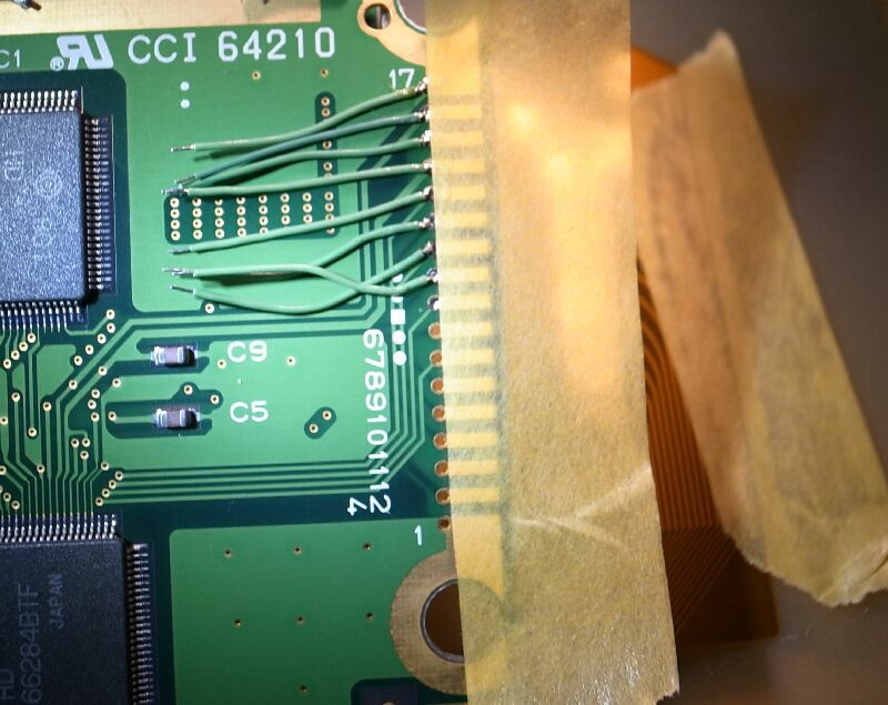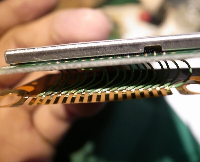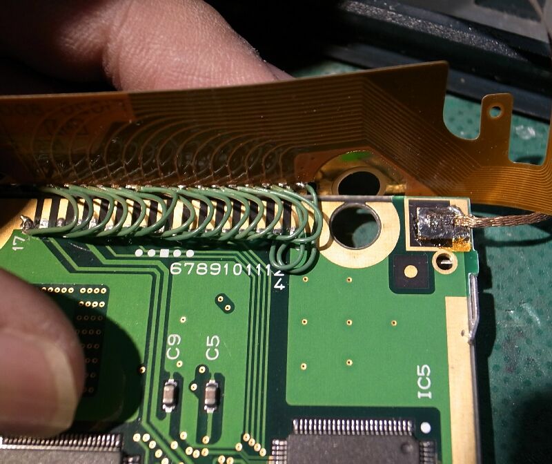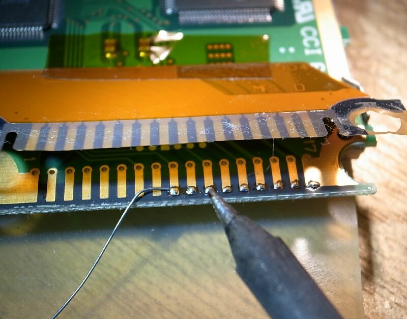 | hp200LX修理:コネクタに起因する表示欠陥に対する最後の修理方法 Ultimate repair method as opposed to display defect. Connector connection by direct soldering. |