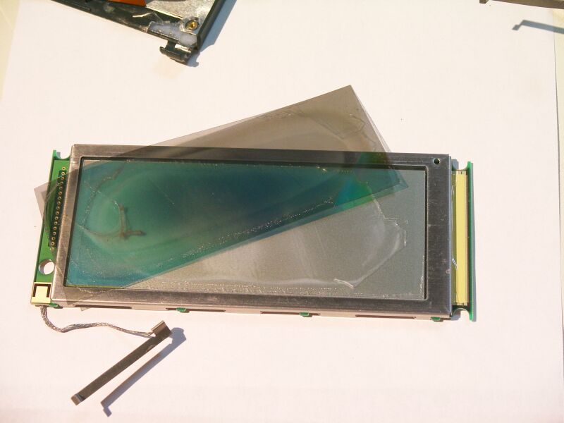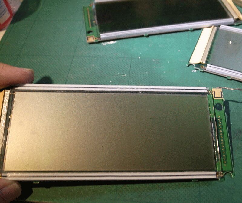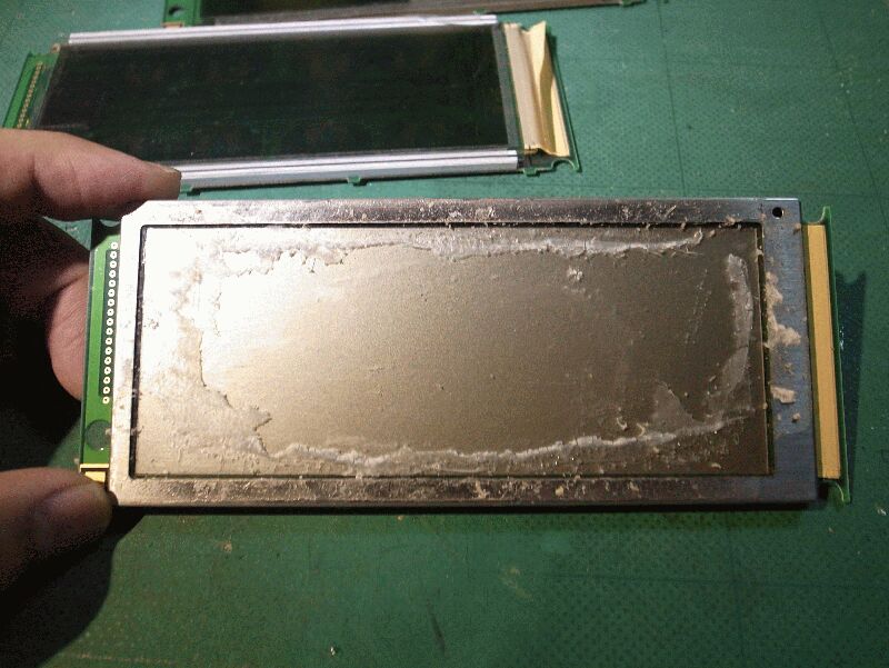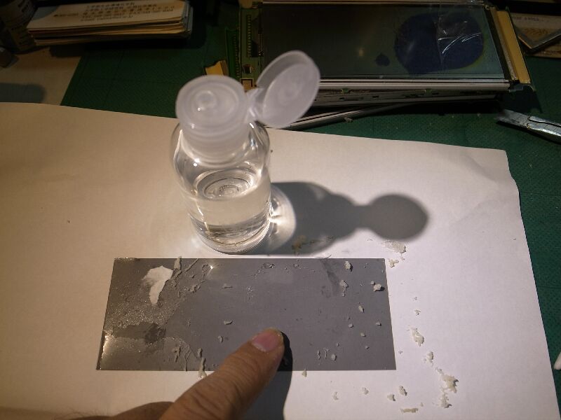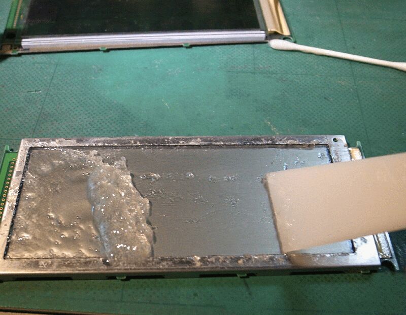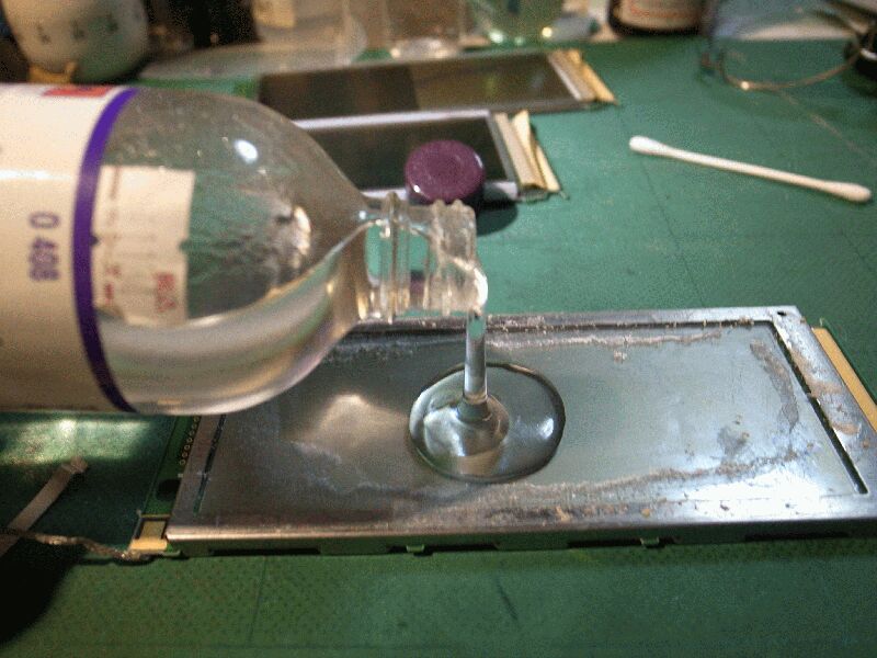 | とにかく表面の偏光板(ポラロイドフィルムシート)を剥がします。(000)この写真は 001以降とは別の液晶です。) 剥がすことで、強烈な酢酸臭(だと思います)が鼻を突きます。 硬化した粘着材は取れずにガラスの表面に残ります。( 001) 残った粘着剤を取るために、剥離剤(ネオ ホルベックス(商標))を垂らします。( 002) (この剥離剤はバックライト改造(backl-ight modification)で使っており、作業性良好です。) 薄いガラスのようにカチカチに硬化していた粘着材も、数分で軟化してプラスティックのへらで掻き取ることができます。( 003) |