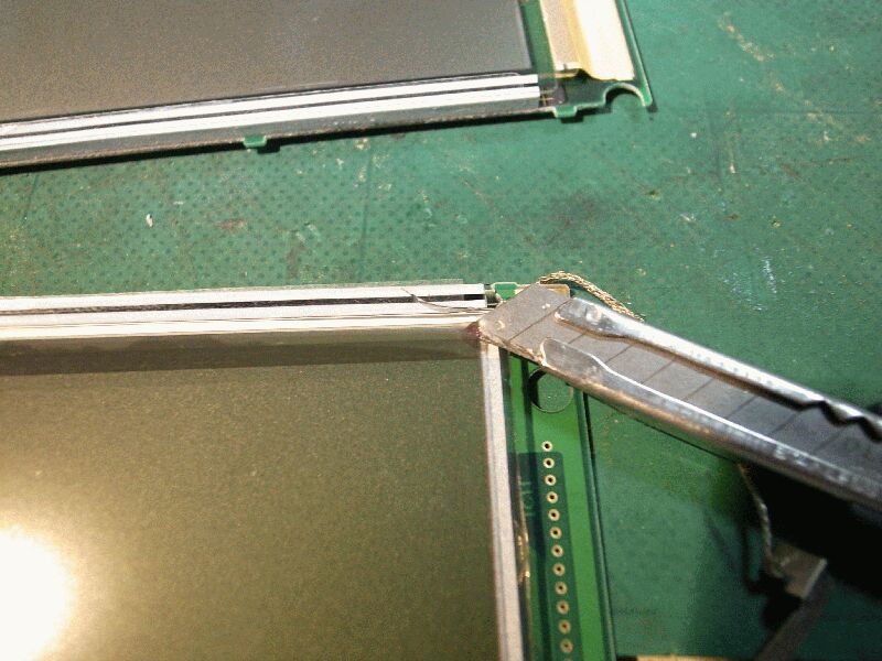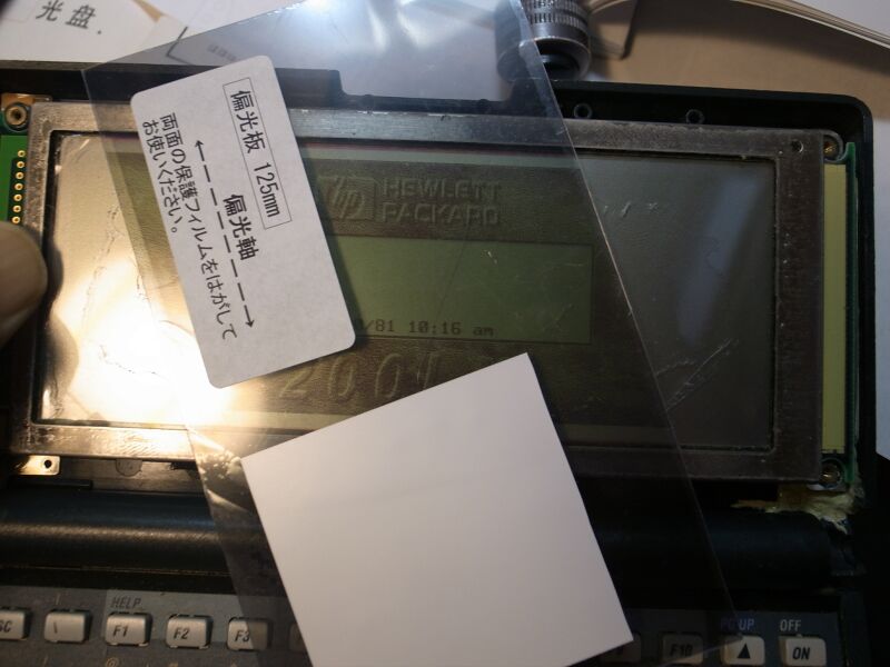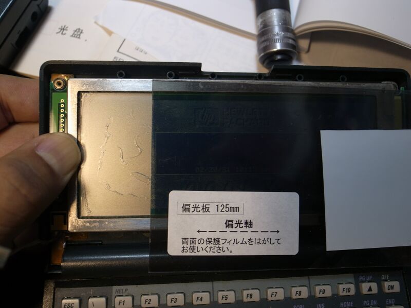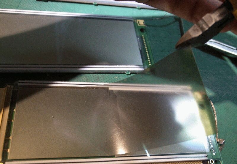 | そこで、表面のポラロイドシート(偏光板)以外が壊れた別の液晶表示部から表面の偏光板のみを移設することにしました。 ドナー(提供機)は、ガラスの一部が割れた液晶表示部を使います。( 005) 偏光板を剥がす際には、ドライヤーを使って表面を十分に暖めます。 隅からカッターの歯を入れ、カッティングプライヤで挟みます。(切断しないように適度な力の調整が必要です。) 007 |