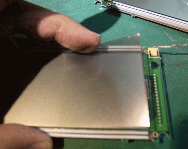 | その後すぐに先ほど鏡面に仕上げた患者(直す液晶)に貼り付けます。( 008)偏光板は結構厚いので、普通に空気を入れないように指でさすりながら貼ることは難しくないという感じです。 綺麗に貼れました。( 009) 表示も綺麗に出ています。( 010)縦に抜けがあるのは、別の原因ですね。 |