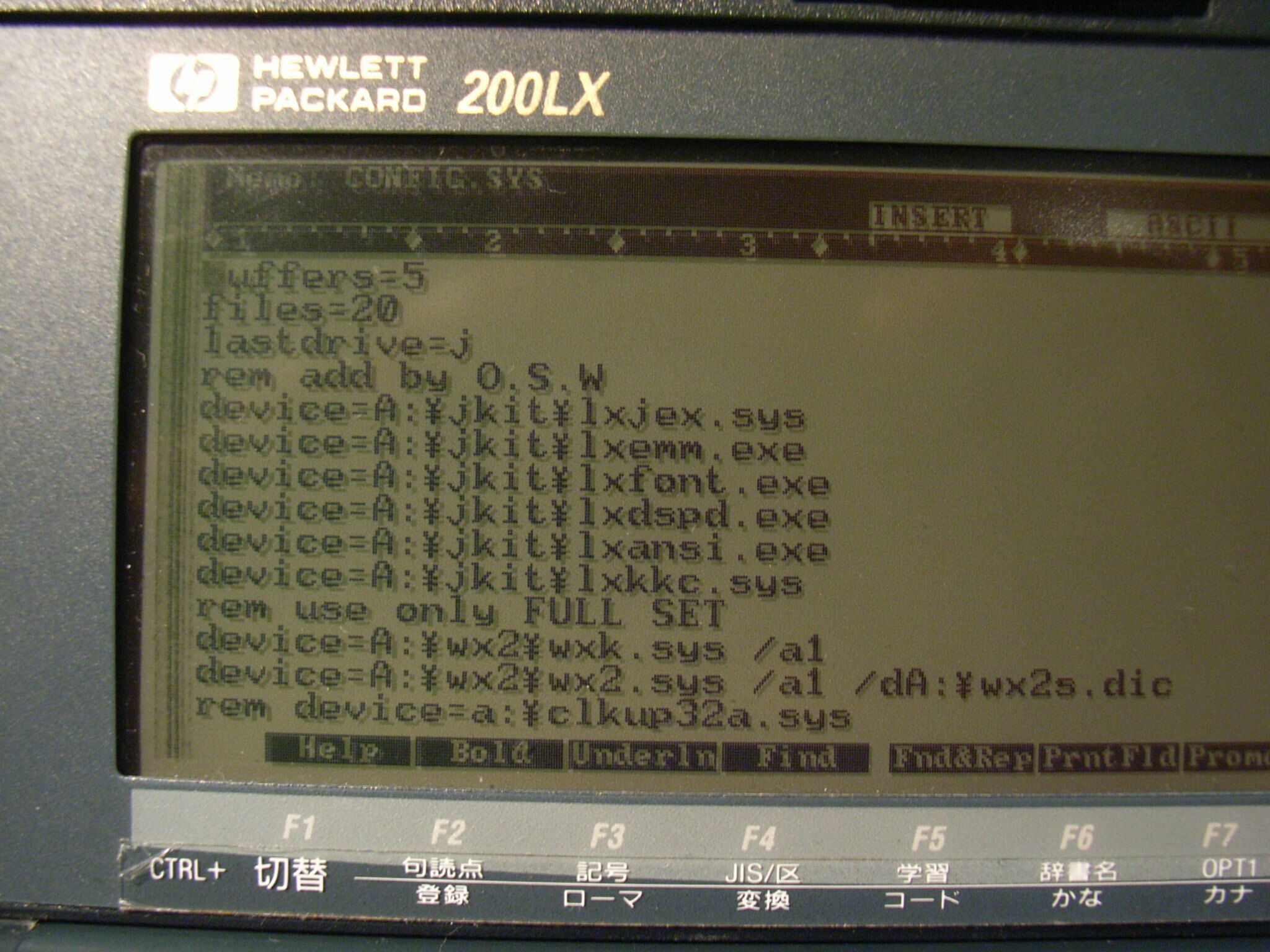 | 前置きが長くなりました。 以下、ドライバ組み込みの一例として、倍速改造後に表示が乱れることを修正する「倍速ドライバ」の組み込み例です。 他のドライバ(日本語化ドライバ、バックライト制御ドライバなど)も組み込み(導入)方法は同じです。) (1)ドライバの用意 倍速ドライバは、 HARUYA’s homepageさんのフリーソフトが使いやすいです。 http://www.asahi-net.or.jp/~mm8h-mr/Software/Software.html ⇒リンク切れになっています。 ⇒入手法 ここで、●31/32/36MHz CLOCK UP DRIVER for HP100LX/HP200LX をクリックして、CLKUPDRV.LZH(12.7KB)をダウンロードし、解凍します。 HARUYAさん作のドライバ各種この中から、改造で取り付けた水晶に合ったドライバを、200LXで使うカードA:(エイドライブ)にコピー(複写)します。(CLKUP.DOCに記された説明を読むと良いでしょう。) ここでは、クロックアップドライバとしてclkup32a.sys をコピーしておきます。 普通にマウスを使ってドラッグアンドドロップでUSBにつないだメモリカードにコピーして大丈夫です。 >ドライバ入手法 (2)ドライバの指定(config.sysの書き換え) ドライバを指定するとは、要するに立ち上げ(boot、ブート)時に読み込まれるドライバを指示する(組み込む)操作です。 DOSでは、立ち上がり時に、環境設定指示(config.sys)と、自動実行指示(autoexec.bat)が読まれ、その指示通りにパソコンが設定されます。 200LXでは、AドライブとCドライブとの両方にconfig.sysがあるときは、先にAドライブから読まれるように、バイオス(BIOS、基本ソフト)で指示(規定)されています。 config.sys:コンフィグシス system configure (装置の概要)の意味 autoexec.bat:オートエグゼクバッチ automatic execution batch 自動実行作業の意味 どちらもテキスト形式で記載された指示ですので、200LXに最初から入っているMEMOで編集(書き換え)できます。 200LXのメモ(memo)で、config.sysを開くメモ帳(内蔵ソフト「memo」)でa:\config.sysと指定して、カード上にあるconfig.sysを編集する。 a:\config.sysが開く。config.sysの内容(倍速ドライバ組み込み前) -------------------------------- buffers=5 files=20 lastdrive=j rem add by O.S.W device=A:\jkit\lxjex.sys device=A:\jkit\lxemm.exe device=A:\jkit\lxfont.exe device=A:\jkit\lxdspd.exe device=A:\jkit\lxansi.exe device=A:\jkit\lxkkc.sys rem use only FULL SET device=A:\wx2\wxk.sys /a1 device=A:\wx2\wx2.sys /a1 /dA:\wx2s.dic -------------------------------- これらはJKIT(ジェイキット、オカヤ製日本語化ソフト)を入れた際に自動的に作られたconfig.sysです。 一行ずつ意味があります。 remと記載されている行は、メモ書きであり、無視されます。 ドライバを追加指定する。まだクロックアップドライバが組まれていないので、左側に乱れた表示が表れている。