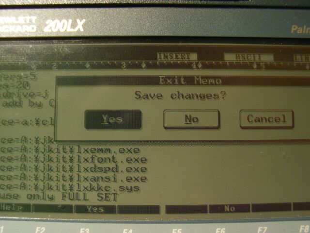 リセット後に組み込まれる。先ほどカードにコピーしておいたクロックアップドライバclkup32a.sysを指定します。 指定というのは、 device=a:\clkup32a.sys という一行を書き加えるということです。 倍速(クロックアップ)ドライバを組み込んだ後のA:\config.sysの内容 -------------------------------- buffers=5 files=20 lastdrive=j rem add by O.S.W device=a:\clkup32a.sys device=A:\jkit\lxjex.sys device=A:\jkit\lxemm.exe device=A:\jkit\lxfont.exe device=A:\jkit\lxdspd.exe device=A:\jkit\lxansi.exe device=A:\jkit\lxkkc.sys rem use only FULL SET device=A:\wx2\wxk.sys /a1 device=A:\wx2\wx2.sys /a1 /dA:\wx2s.dic -------------------------------- ドライバを記載したら、変更を適用させるために、必ず保存します。 拡張子は変更しないで、config.sysのままとします。 memoでの編集後は保存させる。config.sys変更後には、ソフトリセット(ctrl + alt + del キー)させて、再立ち上げ(ブート)させます。 ブート中に倍速ドライバが組み込まれると、乱れた表示が解消される。ブート(再起動)させると、config..sys 上のclkup32a.sys が読まれたころに、表示の乱れが解消されます。 個体によっては、倍速ドライバを入れない場合、乱れがひどく文字が重なって、全く判読できない状態になります。 その場合には、200LXでのmemoも表示が乱れて読めず編集困難になるので、Windows上のメモ帳で編集すれば良いです。 device=a:\clkup32a.sys の意味は、Aドライブのルート上(直下)にある、clkup32a.sysをデバイス(装置)として組み込みなさいという命令です。 従って、ドライバがどこにあるか(置いてあるか)によって、指定の記載を変えます。 例: AドライブのJKITというフォルダにclkup32a.sysがあるときには、 device=a:\jkit\clkup32a.sys となります。 また C:ドライブのclkupというフォルダに入れていれば、 device=c:\clkup\clkup32a.sys となります。 config.sysの記載には、必ず英数半角文字を使います。 (日本語全角では、認識されません。) config.sysの実例 単純な例 buffers=5 files=20 lastdrive=j device=c:clkup31m.sys 日本語入力にATOK8を使い、ACECARD3で大容量メモリカードを使う例 buffers=5 files=20 lastdrive=j rem add by O.S.W device=C:\clkup\clkup31m.sys rem device=a:\clkup\clkup31m.sys device=c:\jkit\memchk.exe device=C:\jkit\lxjex.sys device=C:\jkit\lxemm.exe device=C:\jkit\lxfont.exe device=C:\jkit\lxdspd.exe device=C:\jkit\lxansi.exe device=C:\atok8\atok8a.sys /d1=c:\atok8\atok8.dic /UCF=C:\atok8\ATOK8.UCF DEVICE=C:\atok8\ATOK8B.SYS DEVICE=C:\atok8\ATOK8fix.exe device=C:\atok8\atok8ex.sys device=C:\bin\ACECARD3.COM /SDP JKITを使わない例 files=24 buffers=8 device=a:\sys\kkcfake.sys device=a:\dev\fontman.exe -fa:\dev\fontman.ini -b10 device=a:\dev\yadc.exe -bd device=a:\dev\pansi.sys rem device=a:\arashi\arashiv.sys a:\arashi\dosv.cfg device=a:\dos2\msimek.sys /a1 device=a:\dos2\msime.sys /d*a:\dos2\msimer.dic /c1 /n /a1 /da:\dos2\msime.dic メモを入れてわかりやすくした例 buffers=5 files=20 lastdrive=j device=a:\clkup\clkup31m.sys rem ====add jkit ========== device=a:\jkit\lxjex.sys device=a:\jkit\lxemm.exe device=a:\jkit\lxfont.exe device=a:\jkit\lxdspd.exe device=a:\jkit\lxansi.exe REM device=A:\jkit\lxkkc.sys rem ===jamドライブ組込========== rem device=a:\jam\jam.sys /a=4 /b=1 rem device=a:\jam\jmount.com a:\jamdrv rem use only FULL SET======= REM device=A:\wx2\wxk.sys /a1 REM device=A:\wx2\wx2.sys /a1 /dA:\wx2s.dic DEVICE=a:\ATOK8\ATOK8A.SYS /UCF=a:\ATOK8\ATOK8.UCF /D=a:\ATOK8\ATOK8.DIC DEVICE=a:\ATOK8\ATOK8B.SYS DEVICE=a:\ATOK8\ATOK8EX.SYS 倍速ドライバとバックライトドライバだけ(テスト用)の例 rem device=c:\clkupdrv\clkup31a.sys device=c:\clkupdrv\clkup32a.sys rem device=c:\clkupdrv\clkup36d.sys rem device=c:\clkupdrv\clkup40d.sys device=c:\bklt\blsw.sys 日本語表示はJKITを使わず、FEP(日本語入力)にはWX2を使用した例 buffers=20 files=30 lastdrive=J shell=d:\dos\command.com /p /e:512 device=a:\dos_c\emm200.exe c:\emm200.dat device=a:\dos_c\pansi.sys device=a:\dos_c\fontman.exe -fa:\dos_c\fontman.ini device=a:\dos_c\yadc.exe -v70 -b+ -6- -av -v8,14 -d14,14 -l14 device=a:\dos_c\kkcfunc.sys device=a:\wx2\wxk.sys /a1 device=a:\wx2\wx2.sys /a1 /VF /N /dA:\wx2s.dic 行頭に倍速ドライバを置いた例 device=a:\clkup\clkup31m.sys buffers=5 files=15 lastdrive=j shell=d:\dos\command.com d:\dos /p /e:512 device=a:\jkit\lxjex.sys device=a:\jkit\lxemm.exe device=a:\jkit\lxfont.exe device=a:\jkit\lxdspd.exe -e:8 device=a:\jkit\lxansi.exe device=a:\jkit\sleeples.sys device=a:\jkit\lxkkc.sys device=a:\wx2\wxk.sys /a1 device=a:\wx2\wx2.sys /D*a:\wx2\wx2.dic /da:\wx2\wx2u.dic /ufa:\wx2\wx2u.cfg /n /a1 device=a:\jkit\wcdat.sys 2010.06.12 |