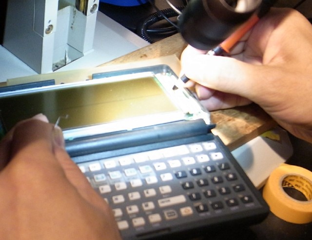 接続は成功。 200LXのセルフテスト(self test)のdisplayを実行すると、横抜け1本が表示されません。 これは、切れている透明電極の1本のみの接続としたため、想定通りの結果です。 (全体に抜けたように見えるのは、表示テストにおいては、隣接した横線を消して交互に表示させるなどの、数パターンが表示されるため。) display test youtube映像 |