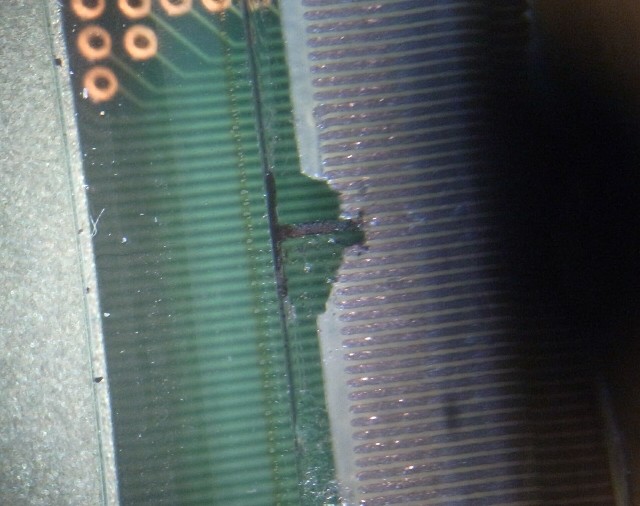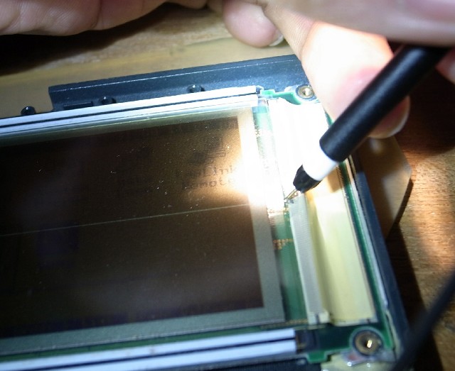 表示の横抜けの原因としては、基板と液晶ガラス上の透明電極とを接続する、フレキ配線(flexible wire pattern)の切れが良くあります。 落下の衝撃等で、上方の1cm以上が完全に切れた場合には、修理をあきらめますが、途中の断線の場合には修理を試みています。 修理例1 2 しかし、原因が液晶ガラス上の透明電極の不良の場合には、修理不能としていました。 修復不能例 |