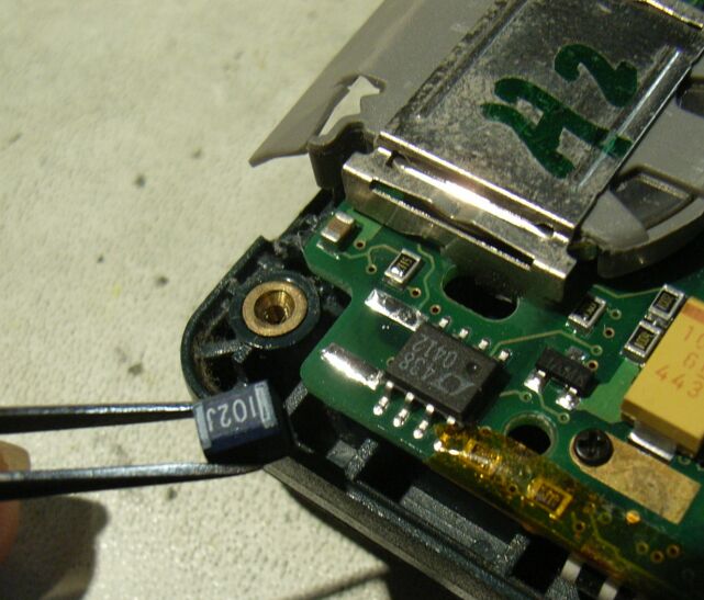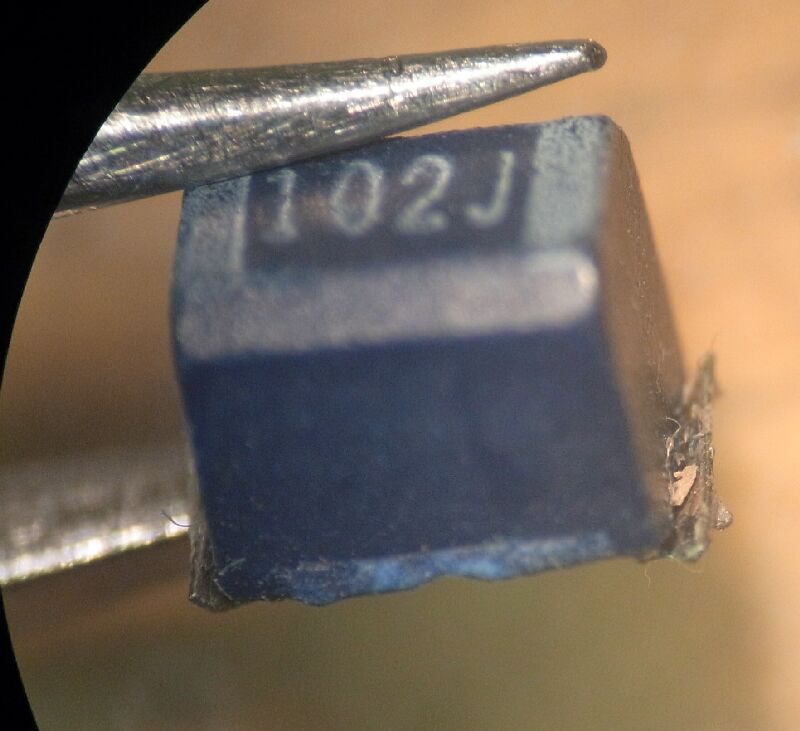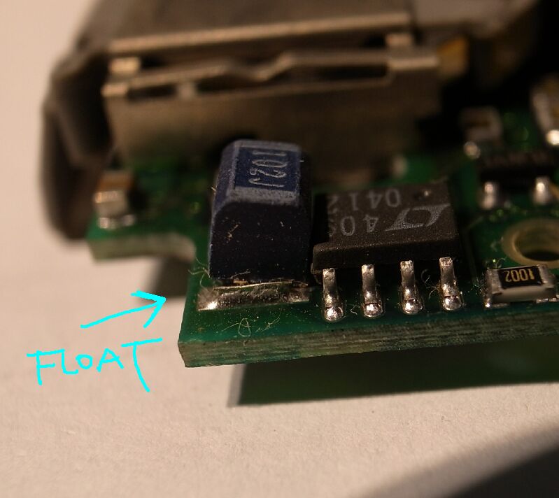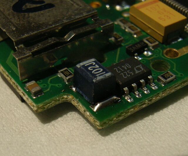 (2012.01.19追加) ![]() 他の個体の例です。 ヒンジ部の分離で、受領したものですが、インダクタにあきらかな傾きが見られます。 電気的には接続されているため、これに関する症状はありません。 たまたま発見したものです。 やはり、視認(visual inspection)は重要だと再認識させられます。 ![]() このインダクタ(コイル部品)を外して点検してみました。 電極部は横幅いっぱいに広がった板状で、単にゆがんでいる状態でした。 したがって、半田は横幅の半分程度が浮いていたものの、導通(電気的な接続)、固定ともに問題ない状況でした。 せっかく傾いていたので、そのまま傾いた状態で再取り付けしました。 (筐体からの逃げを生かした取り付けとしました。) すなわち、この部分に傾きがあっても、がたつき(動き)がなければ外すまではなく、浮いた電極部半田を盛ればよい状況といえます。 |