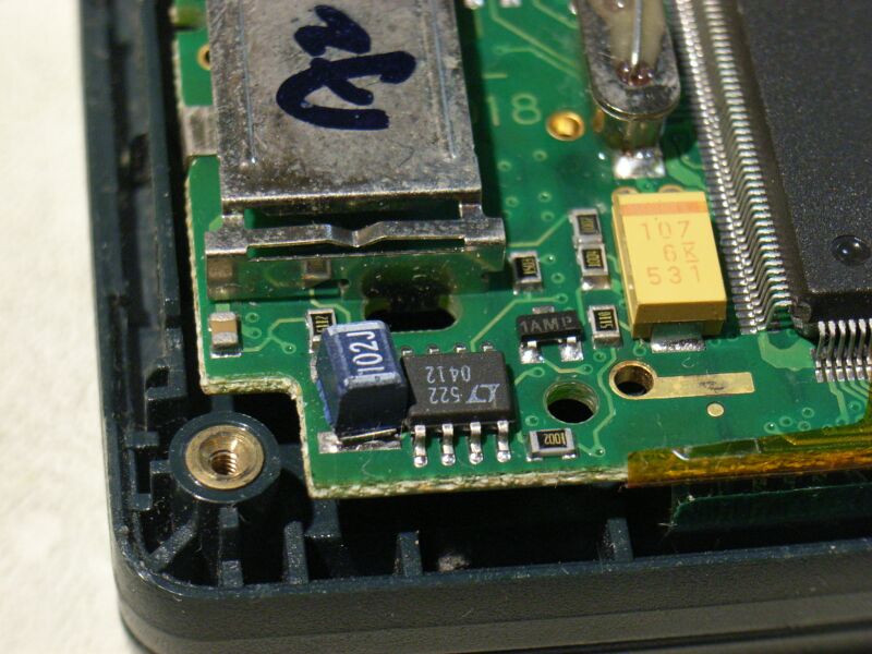 | 今回のトラブル(故障、trouble)は、電池を交換すると、C:ドライブ(RAMドライブ)の内容が消えてしまうというものです。 ![]() 正常表示のメニュー画面 ![]() 主電池(単三)を抜くと、初期画面になってしまう。 200LXでは電池を抜いても、RAM(ランダム・アクセス・メモリ、書き換え可能な一時保持メモリ)の内容が消えないように、バックアップ電池が搭載されています。 この電池の電圧が低下すると、「BKUP BATTERY LOW−PRESS ESC」の警報表示(Warning message)が出るので、バックアップ電池の交換時期がわかります。 ところが、今回の事例では、メモリバックアップ電池に関する表示(警報)は無く、当然バックアップ電池を交換しても同様に主電池を抜くと内容が消えてしまいます。 つまり、バックアップ電池の電圧検知回路は正常に動作しているものの、肝腎のメモリ保持電圧が供給されていないような状況です。 ![]() 部品の半田割れ 補助電池(backup battery)のホルダ付近を点検すると、半田の割れ(soldering crack)のある部品が見つかりました。 ![]() 部品を外す。 半田割れのある部品を外すと、102Jと記載されており、形からインダクタ(コイル)のようです。 ![]() 計測する。 LCRメータ(誘導・静電容量、抵抗計)で計ると、1.08mH(ミリヘンリー)が表示され、正常のようです。 ![]() 半田付けして戻す。 元の位置に戻して、半田付けすることで正常になりました。 (電池を外しても、Cドライブは保持され、初期画面になることは無い。) ![]() インダクタは基板の角に位置する。 今回外れかかっ(電気的に切れ)ていた部品は、本体に装着された場合に、ちょうど角に位置しています。 おそらく、落下等の衝撃で、本体ケースが歪み、部品(インダクタ)に強い力(ショック)が加わって半田が外れたものと思われます。 落下等のショックと思われる部品の外れによる、他の例としてダイオードの外れがあります。 半田だけの不良(外れ)であれば、何度でも正常に戻すことができます。 200LXは丈夫な機械だと思います。 2010.05.10 |