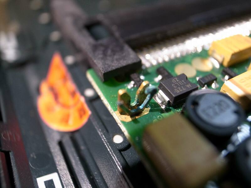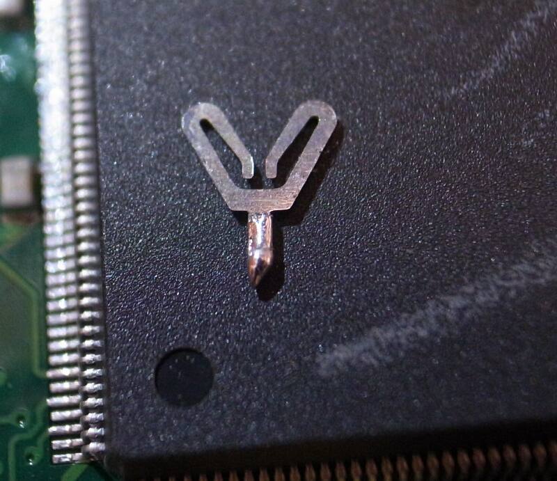 これは、基板上の電極部ですが、バネ力を持つ手前側のクリップ「Y字型」の大半が消失しています。